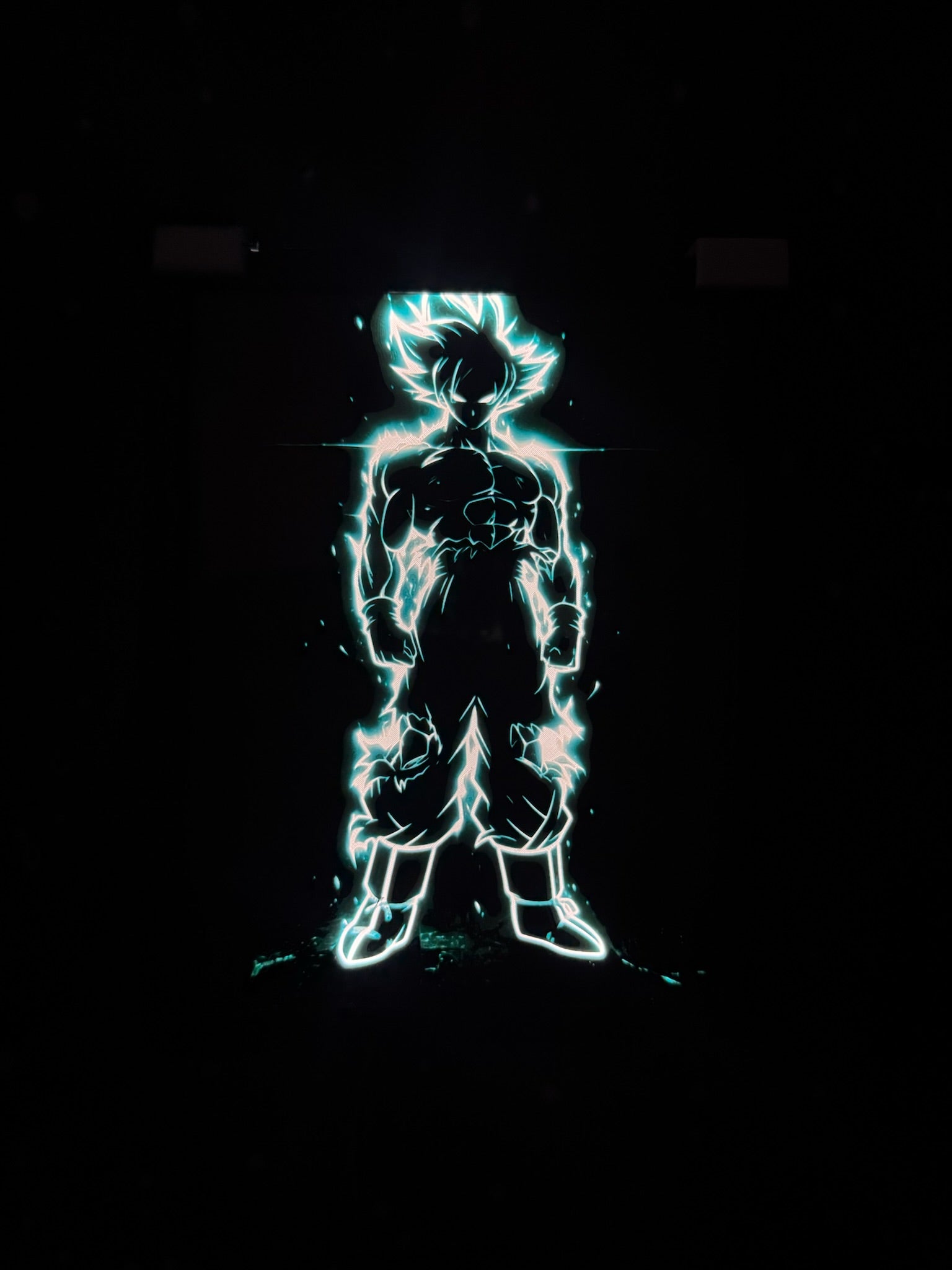 Αυτό το συλλεκτικό κομμάτι φωτεινής τέχνης αποτυπώνει τη χαρακτηριστική σιλουέτα του Goku μέσα σε λαμπερό κυανό-λευκό φως, αποπνέοντας δύναμη, ακρίβεια και ατμόσφαιρα εμπνευσμένη από το anime.