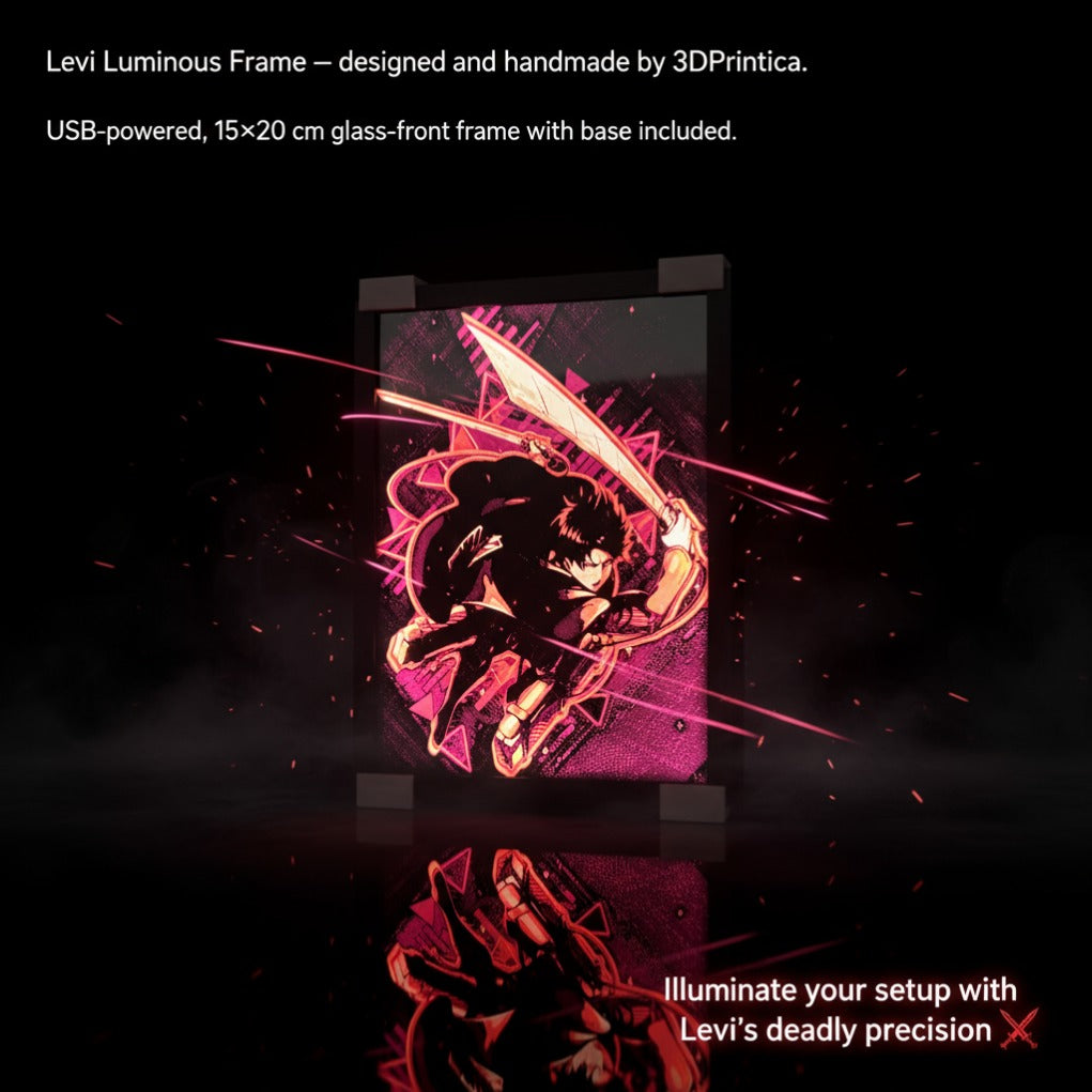 Φέρε τη δύναμη και την αποφασιστικότητα του Levi Ackerman στον χώρο σου με το Levi Luminous Frame, σχεδιασμένο και χειροποίητα κατασκευασμένο από τη 3DPrintica.
